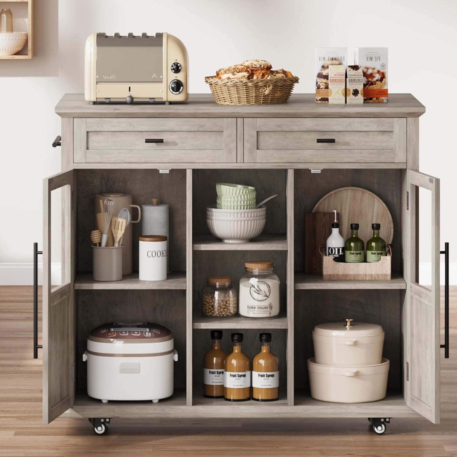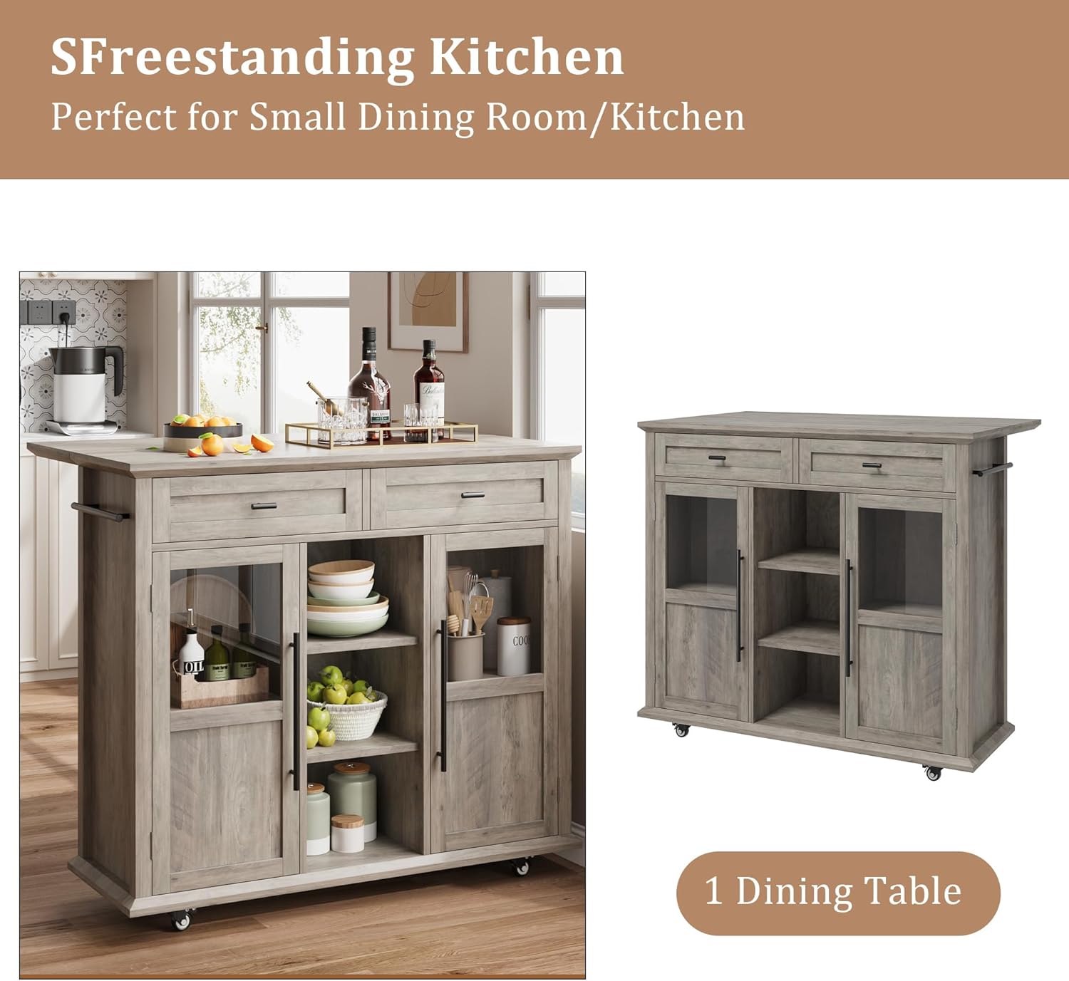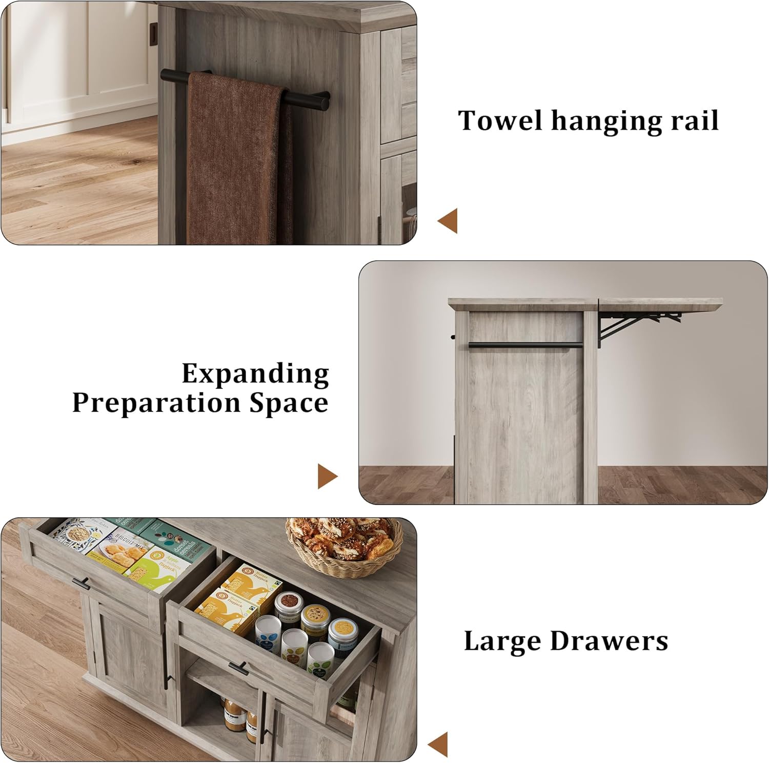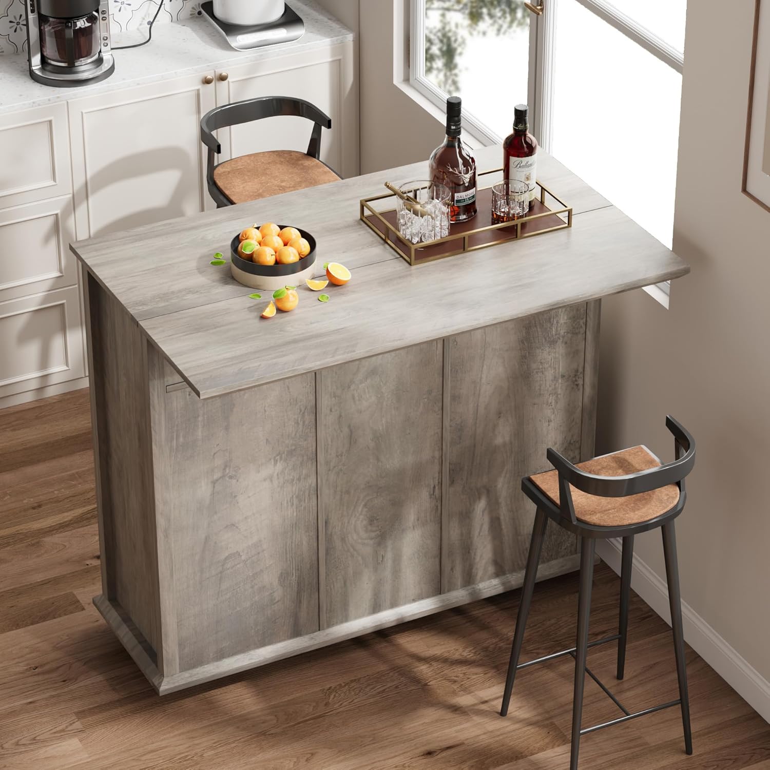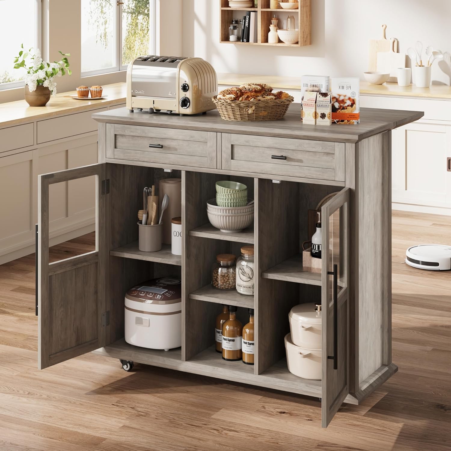 GarveeHome Rustic Kitchen Island with Storage, Island Table on Wheels with Drop Leaf, 41″ Coffee Bar with 3 Storage Methods, Portable Kitchen Table Kitchen Carts, Gray